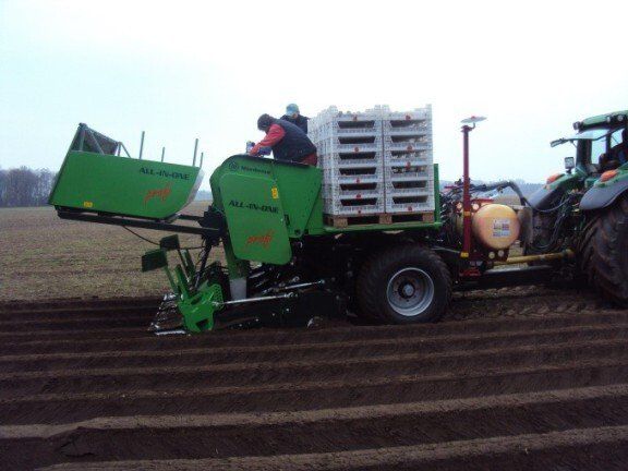 ALL IN ONE с реверсивными ковшовыми ремнями и четырьмя посадочными местами для ручной загрузки предварительно пророщенного молодого картофеля. Никакой специальной машины не требуется. Может быть дооснащен для всех AIO.